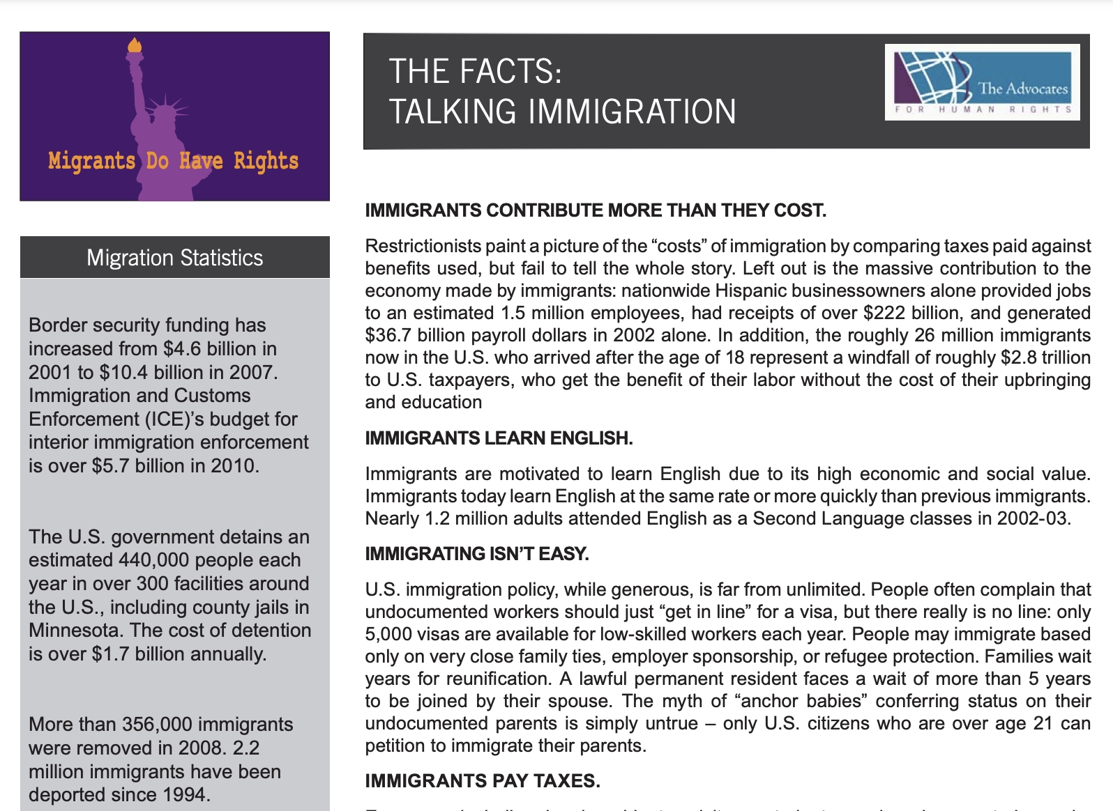 This fact sheet explores some of the common myths and facts about immigration, including its economic impact, immigrants and taxes, and the human rights of immigrants.